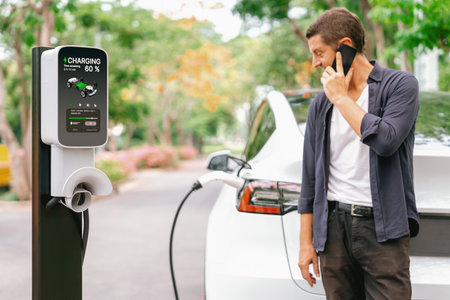 Man talking on smartphone while recharging electric car battery charging from EV charging station during vacation holiday road trip at national park or autumnal forest. Exalt