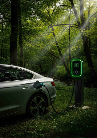 A modern charging station surrounded by vibrant foliage encourages eco-friendly travel in nature.