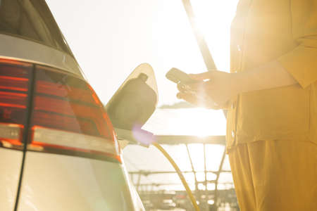 The driver picks up a cable to charge the electric vehicle. A modern and eco-friendly mode of transport that has spread throughout the world.