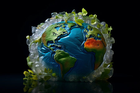 An artistic depiction showcases an earth globe sprouting greenery. The image presents a vibrant display of life and growth against a dark background. The style uses digital art techniques. This visual could be used in various contexts, including editorial articles and commercial projects.
