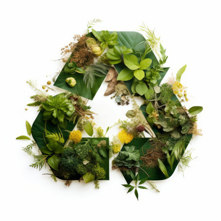 A creative green recycling symbol constructed with lush leaves and organic elements on a white backdrop, perfect for promoting environmental responsibility, sustainable practices, and
