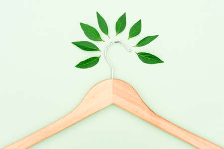 Wooden clothes hanger with green leaves over mint background as a symbol of conscious consumerism, slow fashion and environmentally friendly fashion. Reuse, recycling and upcycling clothes concept