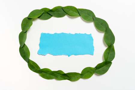 Blank Paper Placed Between Fresh Wreath Made Of Leaves For Layout Of Wedding Invitation And Cards. Leafage Surrounding A Notation Paper Sheet For Business Promotion.
