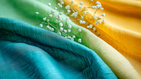 A cotton fabrics in shades of yellow, green and blue, showcasing the texture and softness. AI generated