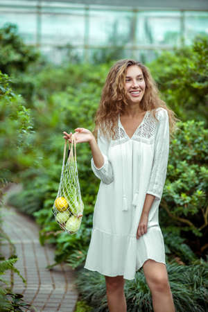 Picture of a young woman in a white dress with a mesh bag with fruits in hands