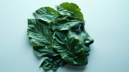 A serene profile of a face elegantly merged with fresh green leaves, symbolizing a union with nature. Artistic and peaceful, captured by Generated AI