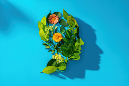 A silhouette of a human head composed of calming green leaves is set against a tranquil blue backdrop, creating a serene and natural atmosphere.