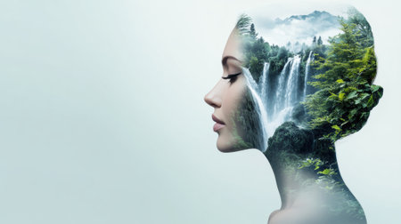 This captivating double exposure image features a woman profile intertwined with lush greenery and a serene landscape, symbolizing a deep connection to nature.