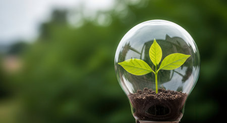 Fresh green plant sprout growing in dark soil inside a clear glass lightbulb, representing eco friendly energy, growth, and environmental sustainability.