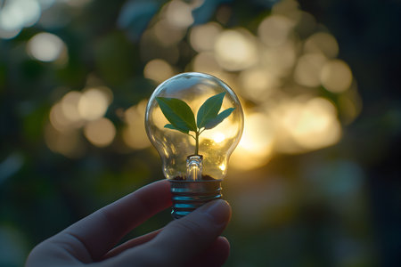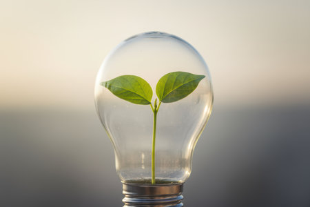 A light bulb with a green plant sprouting from it, representing growth, sustainability, and eco-friendly living.