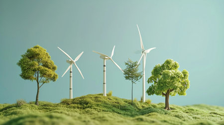 A captivating miniature scene featuring wind turbines, vibrant greenery, and a focus on renewable energy, illustrating a commitment to environmental sustainability and innovation.