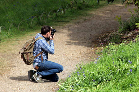 Wisley, Surrey, UK - April 30 2017: Male photographer in checked shirt, kneeling on a path to take a photo