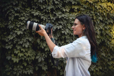 Woman with camera outdoors. Girl takes pictures. Hobby, leisure or profession