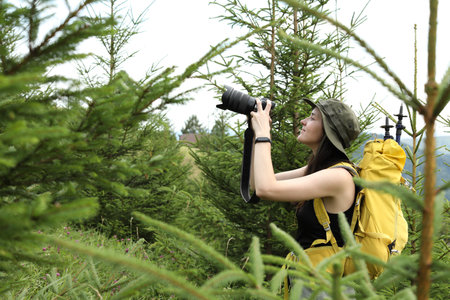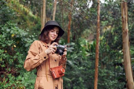 Traveler photographing scenic view in forest. One caucasian woman shooting close up look. Girl hold dslr mirrorless camera in his hand. Professional photographer travel with backpack. Outdoor.
