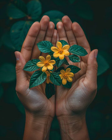 Hands holding delicate yellow flowers with green leaves, representing nature, beauty, and growth