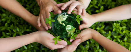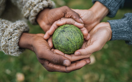 Several hands of diverse skin tones gently cradle a textured green sphere. The composition features a close-up perspective with a blurred background suggesting an outdoor setting. The image uses natural lighting and suggests themes of environmental care and community. Suitable for various editorial and commercial applications.