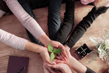 Group of people holding green plant in the hands. Teamwork concept
