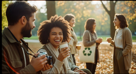 A group of friends socialize in a park during autumn, with fallen leaves and trees in the background, enjoying coffee and conversation.