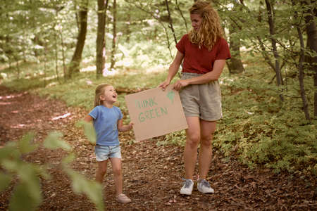 Little caucasian girl with mother holding poster protecting the planet