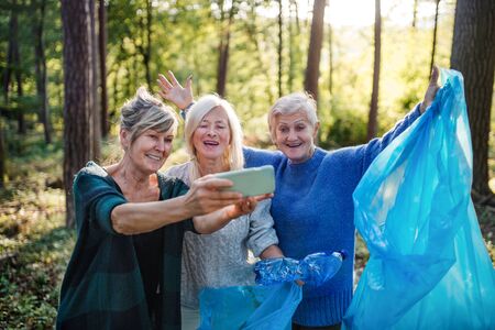Senior women friends picking up litter outdoors in forest, taking selfie.