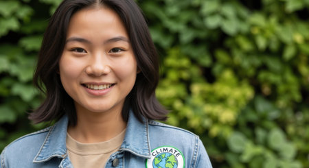 Smiling young Asian woman with climate change badge on jacket. Environmental activism and youth day concept for global future education.