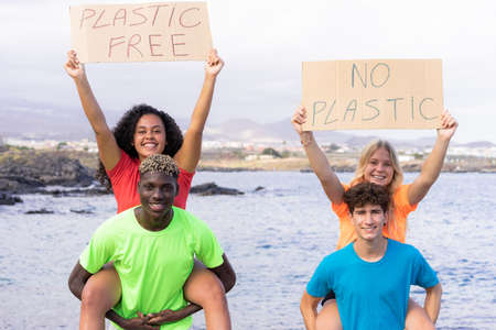 Smiling volunteer people showing posters plastic free and no plastic. Ecology concept, recycle symbol, zone with no plastic.