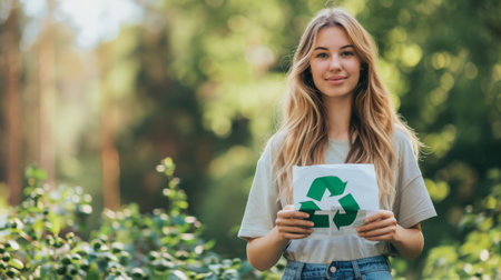 Young volunteer woman holding paper with green recycling sign over blurred natural background. Eco living, environment, sustainability concept. Generative ai.