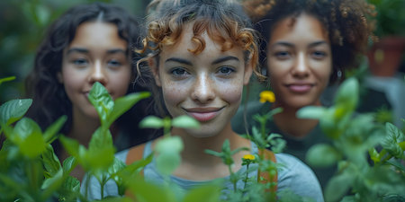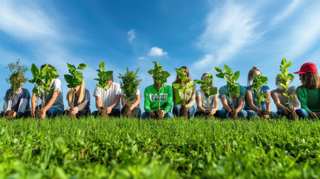 A diverse group of individuals sits on a lush green field, holding plants and leaves in front of their faces under a bright blue sky. This scene symbolizes environmental consciousness and the importance of nature for a sustainable future.