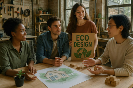 Four architects are discussing an eco friendly house project, using a cardboard model and blueprint in their workshop