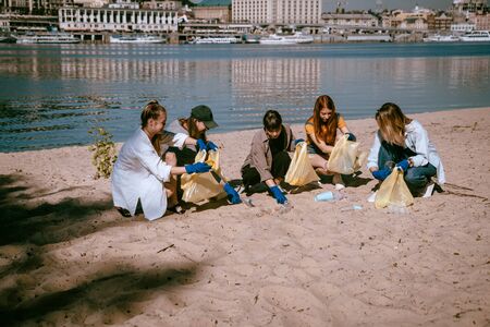Group of activists friends collecting plastic waste on the beach. Environmental conservation.