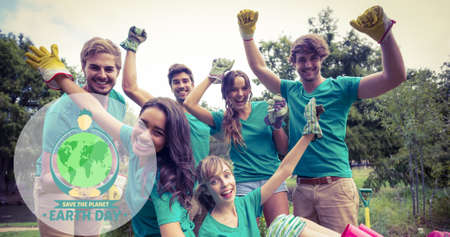 Composition of green globe logo and earth day text over cheering volunteers cleaning up countryside. global conservation and earth day concept digitally generated image.