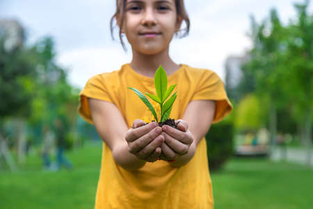 The child holds the plant and soil in his hands. selective focus. kid.