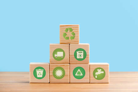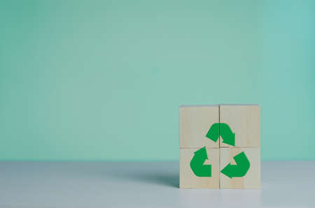 Wooden cube with recycle icon and green industrial. Eco-friendly business and development concept on background.
