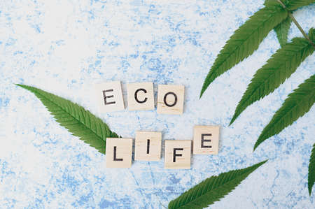 inscription eco life is made of small wooden blocks printed on a gray-blue cement background with fresh bright green leaves