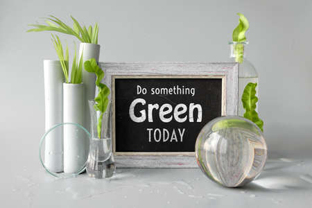 Natural laboratory. Text Do Something Green Today on blackboard. Exotic green leaves in transparent glass jars, vials, Petri dishes. Reflections, floral elements distorted in water. Purple toned image