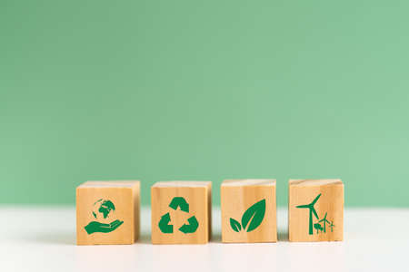 Environmental sustainable concept. Save of earth and environment, net zero emissions and carbon neutral. Wooden cubes with save world and eco friendly icons. World earth day. Eco friendly companies.