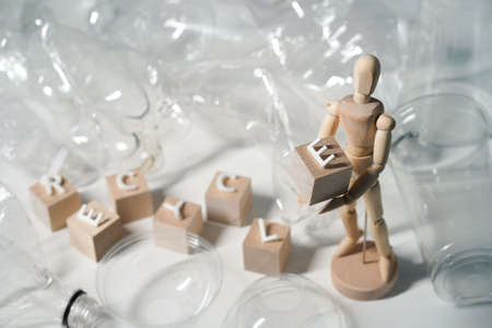 Wooden man and wooden cubes with the text RECYCLE surrounded by plastic on a white table.