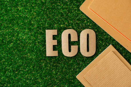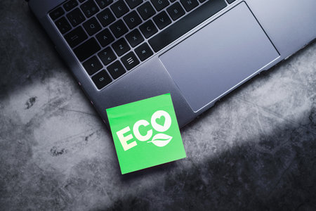 Flat lay photo of green adhesive note on laptop with ECO life text. Save the planet. Energy efficiency concept.