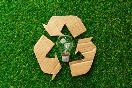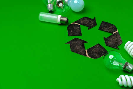 Eco lightbulb from green leaves top view. Renewable and saving energy concept.