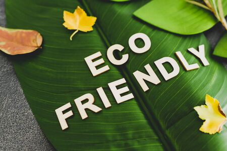 ecology and respect for the environemnt conceptual still-life, Eco-friendly text on top of tropical banana and monstera leaves