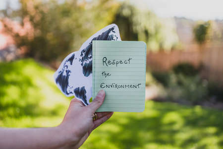 ecology and sustainable development concept, hand holding Respect the Environment message and world map under the sun with garden bokeh bakcground