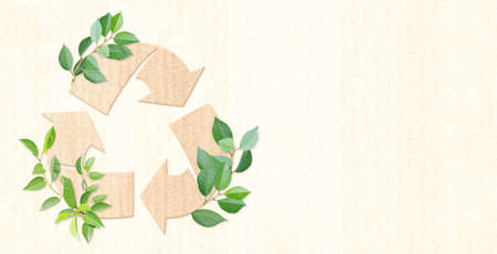 Ecology and zero waste concept. Arrows recycle symbol and green leaves on cardboard texture. Horizontal banner with eco paper texture. Recycled carton material. Copy space for text. Mock up template