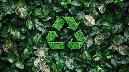 A creative depiction of the green recycling symbol surrounded by leaves, illustrating the concept of eco-conscious living and the importance of waste recycling.