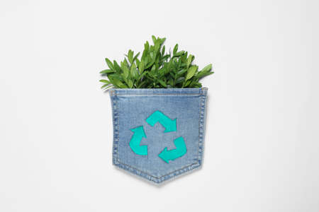 Twigs of green plant in jeans pocket with recycling symbol on white background, top view