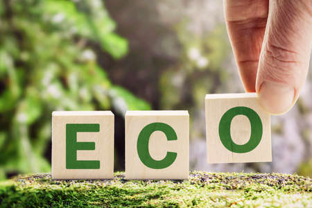 A hand puts cubes into the word eco on a green forest background. Ecology concept and green energy and energy saving, green environment concept. conservation of forests and bioresources