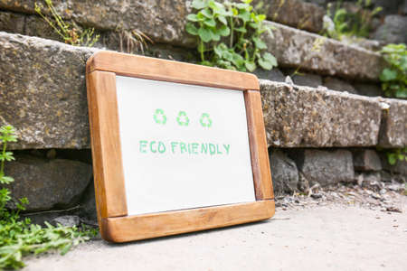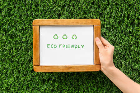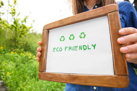 Woman holding board with text ECO FRIENDLY outdoors, closeup