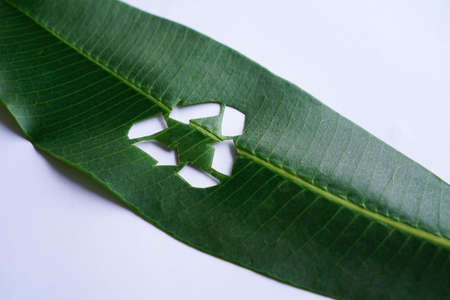 Zero Carbon Emission and ESG Concepts. Clean Energy. Close-up of Green leaf a Recycling Paper Tag. Produce a Green Power. Sustainable Resources, Big deal for Company to Concern about Environmental