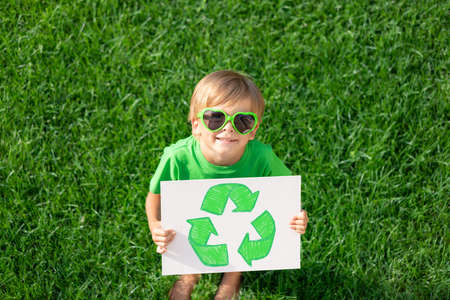 Happy child playing outdoor in spring park. Kid lying on green grass. Earth day and ecology concept. Boy holding paper blank