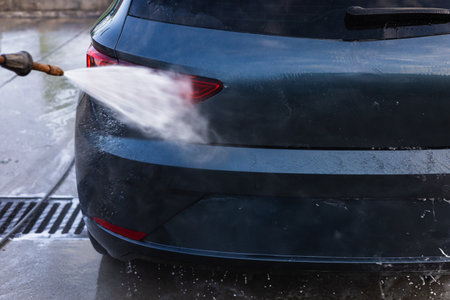 Cleaning automobile with high pressure water jet at car wash