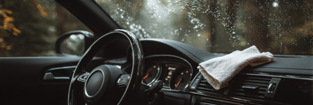 A car interior features a rain-covered windshield, showcasing droplets while a cleaning cloth rests on the dashboard during a cozy afternoon drive.